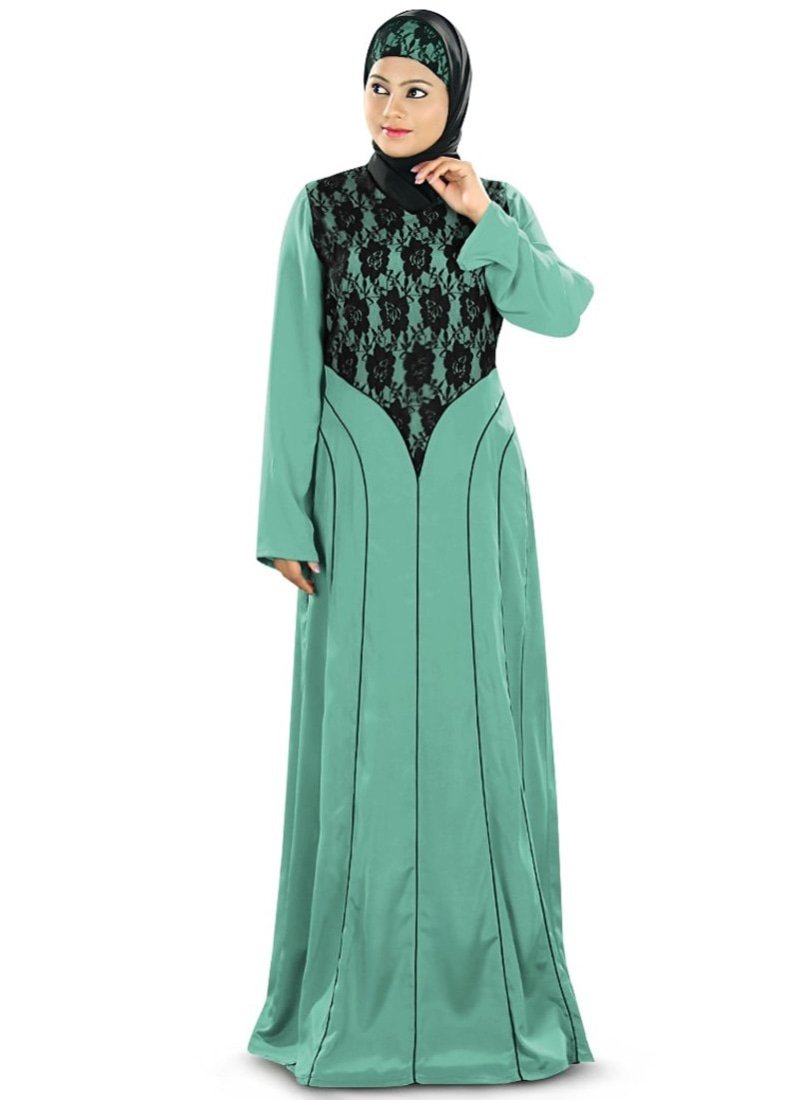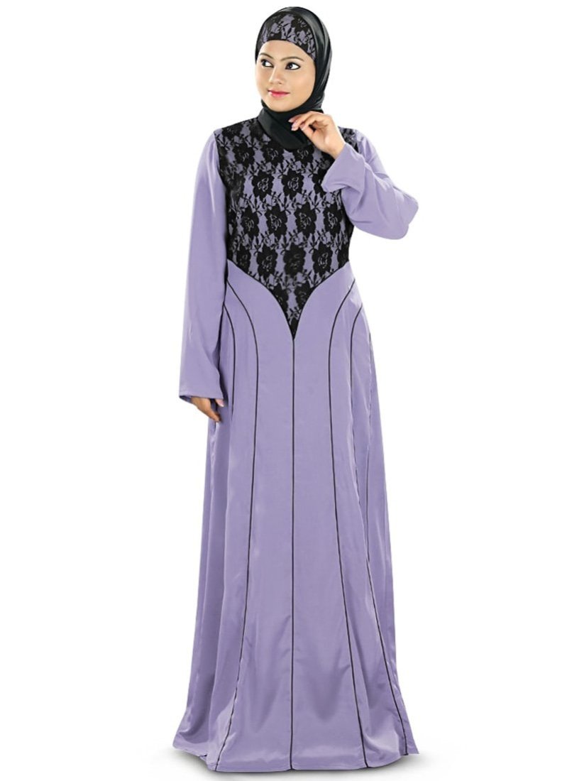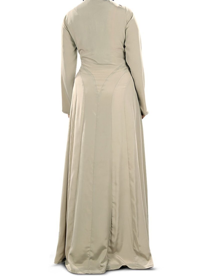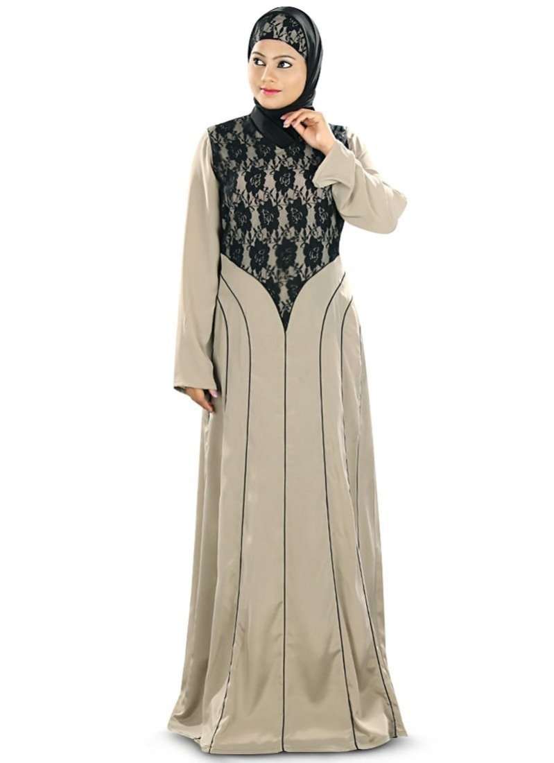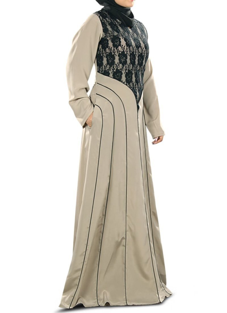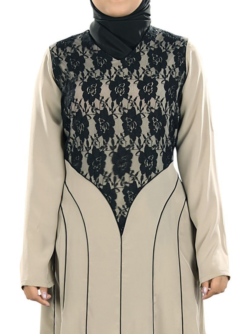 Arabicattire's exclusive & stylish warm grey panel Abaya with black piping, smooth & comfortable crepe-net fabric for multi-occasion use