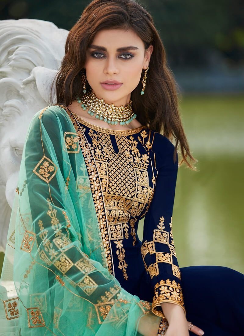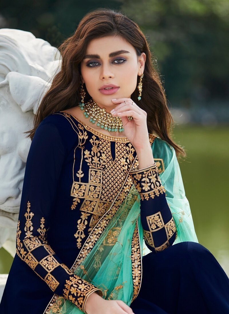 Arabic Muslim Navy Blue colored Salwar Kameez in Anarkali Style made with Real Georgette top and Real Georgette Bottom fabric