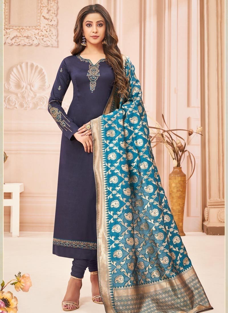 Navy Blue Pure Cotton Jam Silk Chudidar Dress