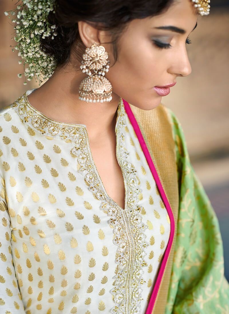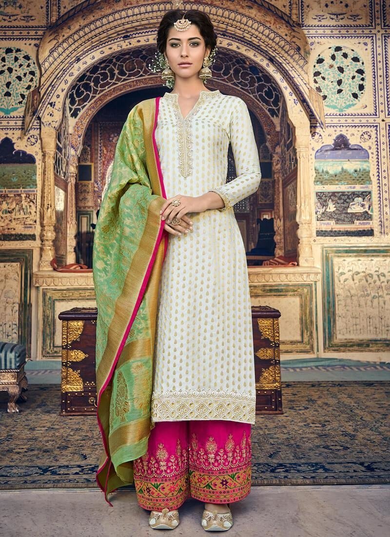 Arabic Muslim Off White colored Salwar Kameez in Palazzo Style made with Chiffon top and Silk 2 Tone Bottom fabric