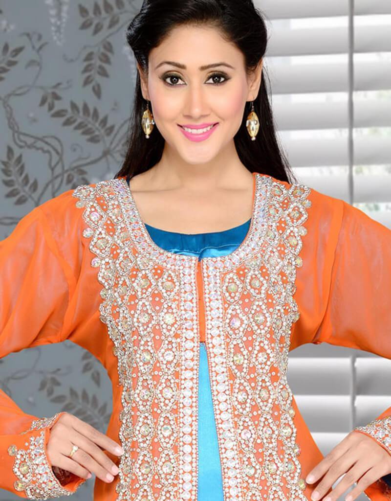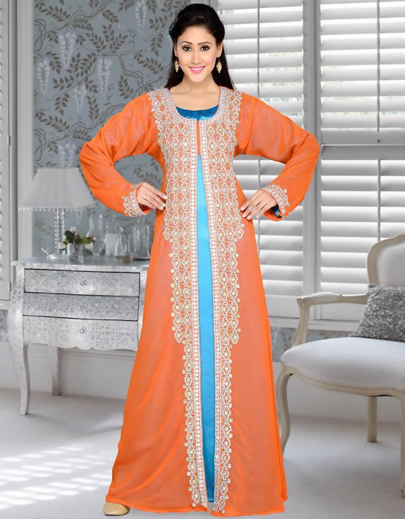 - We Are To Breathe Life Into Your Aspirations & To Make A Mark In The World Of Style Make The Heads Turn When You Dress Up In This Charming Duke Blue and Orange Kaftan.This Attire Is Lovely Designed With Hand Beaded Work.