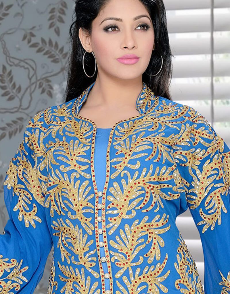 - Machine Work Overall Work Jacket Style Wear Golden embroiderd kaftan in Georgette Fabric and Turquoise Color with Golden Embroidered Jacket Style