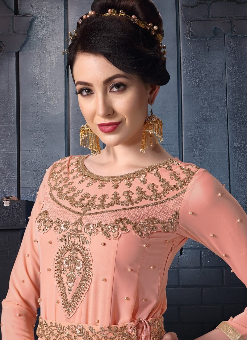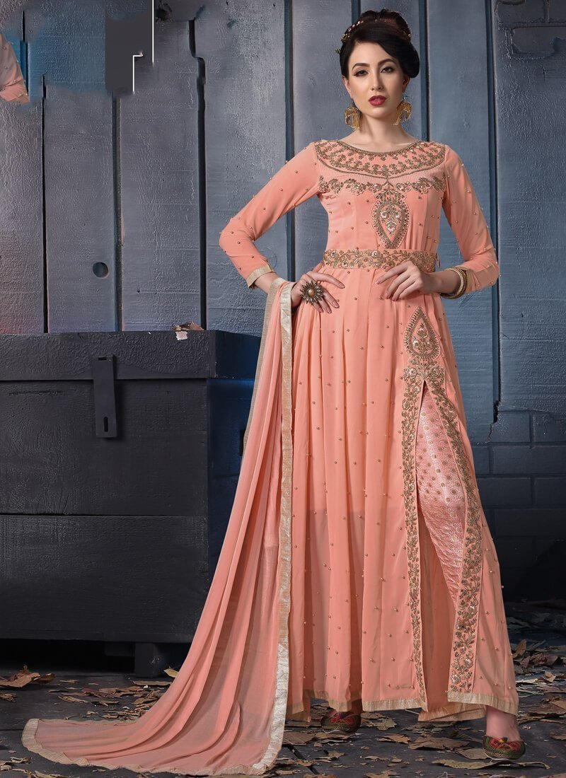 Arabic Muslim Peach colored Salwar Kameez in Pant Style made with Pure Chiffon top and Soft Jacquard Bottom fabric