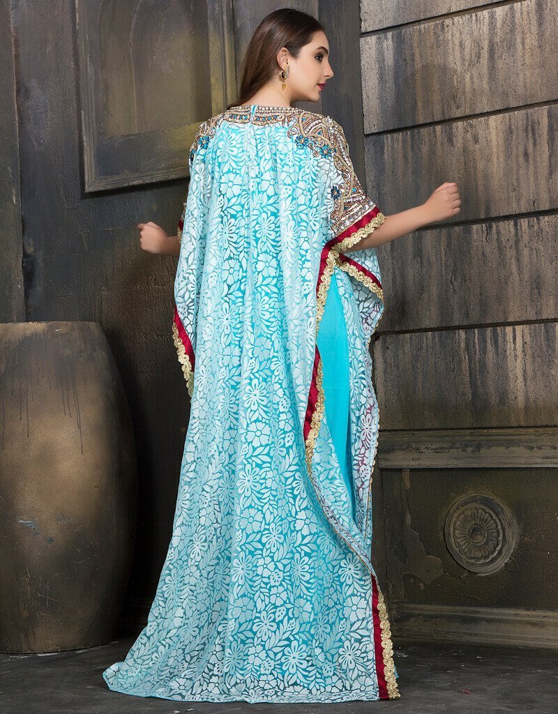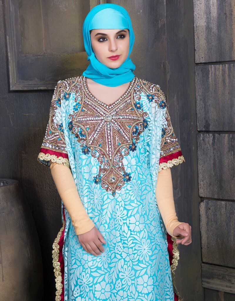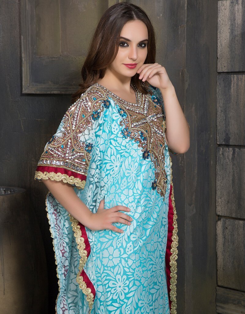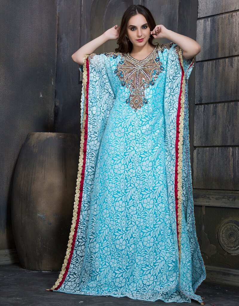 - printed Designer Farasha Caftan Blue Color in Net Fabric with Multi Necklace Style Work