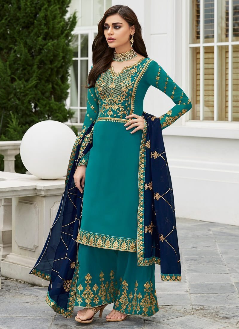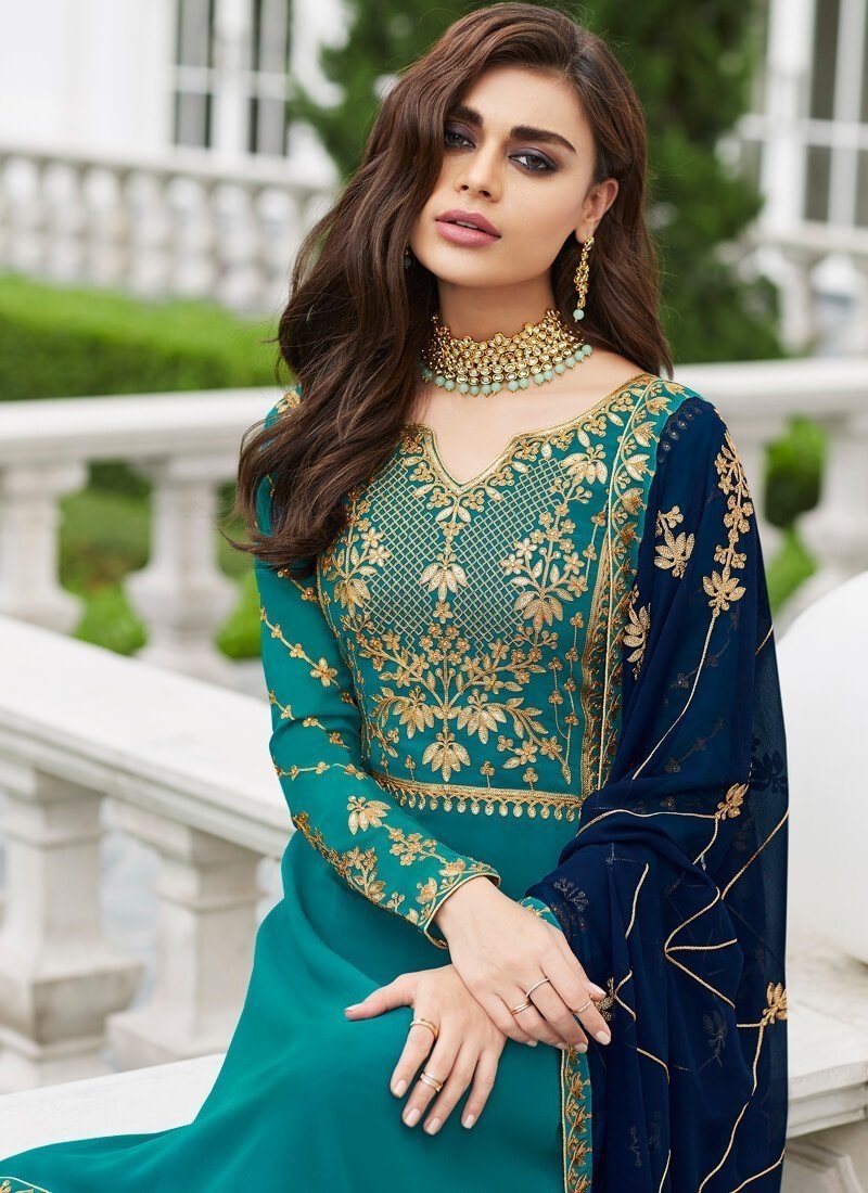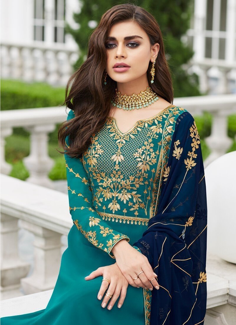 Arabic Muslim Rama Green colored Salwar Kameez in Anarkali Style made with Real Georgette top and Real Georgette Bottom fabric