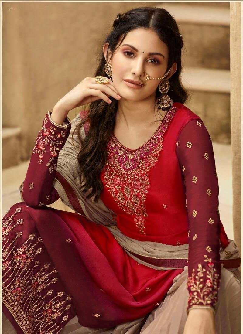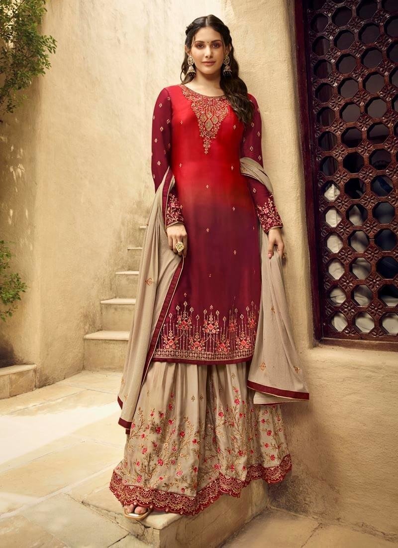 Red And Maroon Satin Georgette Sharara Suit