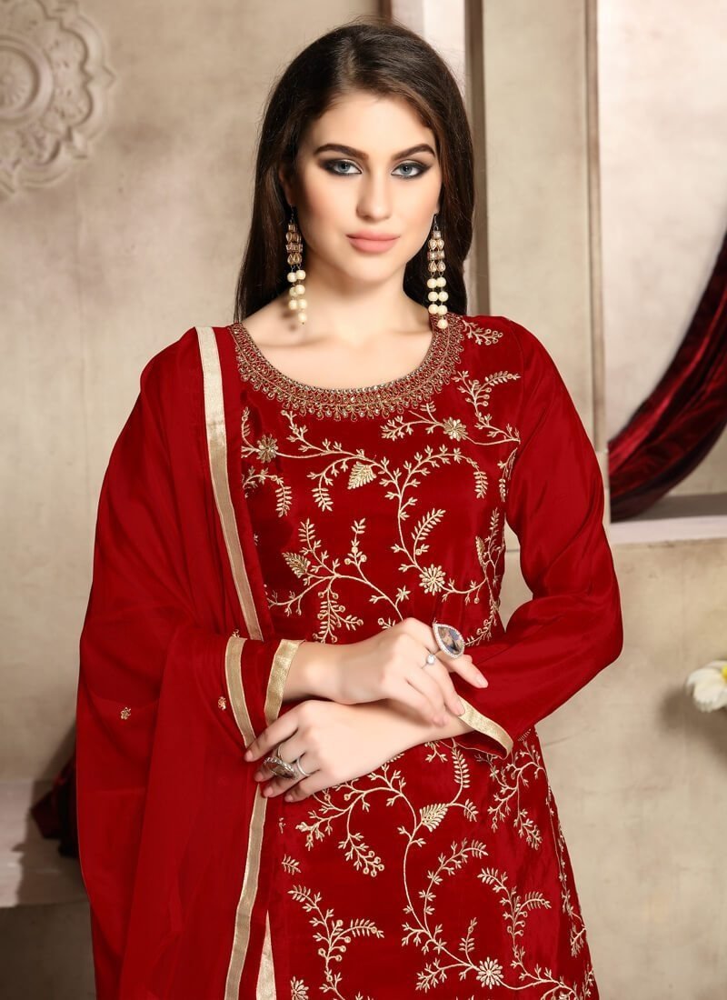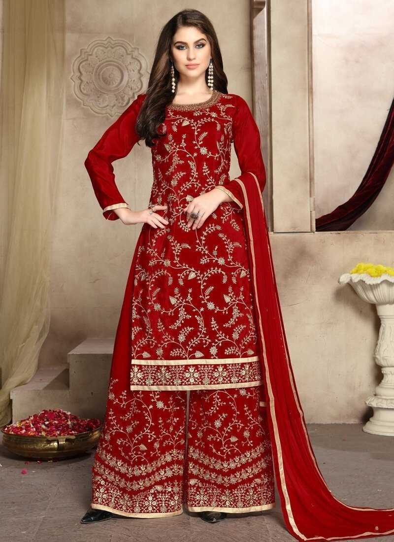 Arabic Muslim Red colored Salwar Kameez in Palazzo Style made with Net top and Georgette Bottom fabric