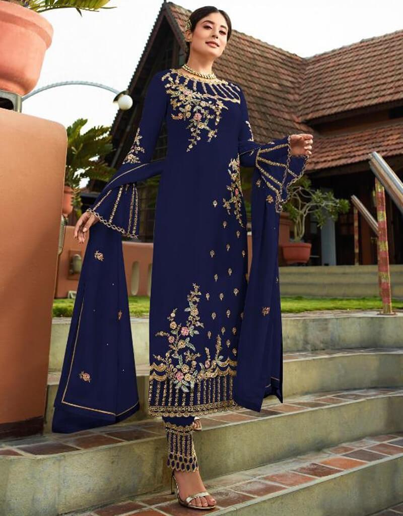 Designer Straight Royal Blue Colored Heavy Faux Georgette Top With Royal Blue Colored Heavy Santoon With Embroidery Work Bottom.
