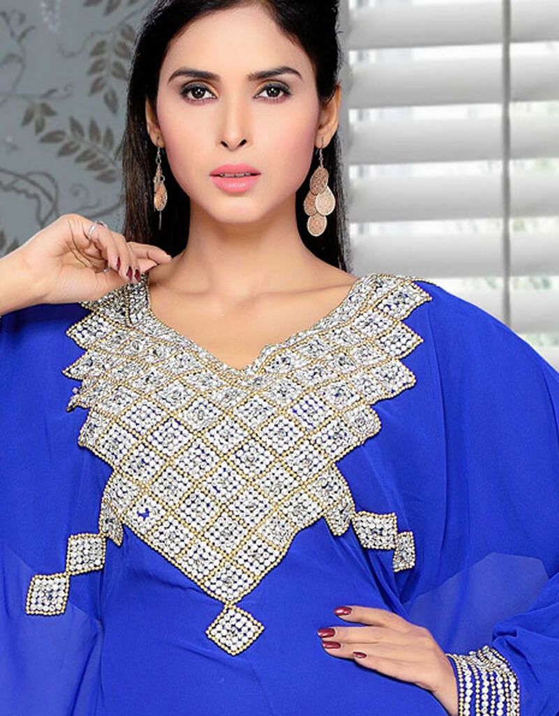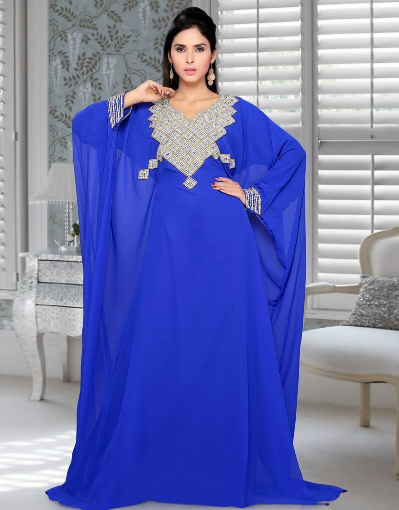 - If You Are A Diva Who Loves To Turn Heads Wherever You Go & This Delightful Drape Is A Must-Have Item For Your Closet. Make An Adorable Statement In This Smashy Medium Aquamarine Trendy Sleeves With Cuff Kaftan.This Ravishing Attire Is Amazingly Hand Beaded Work.