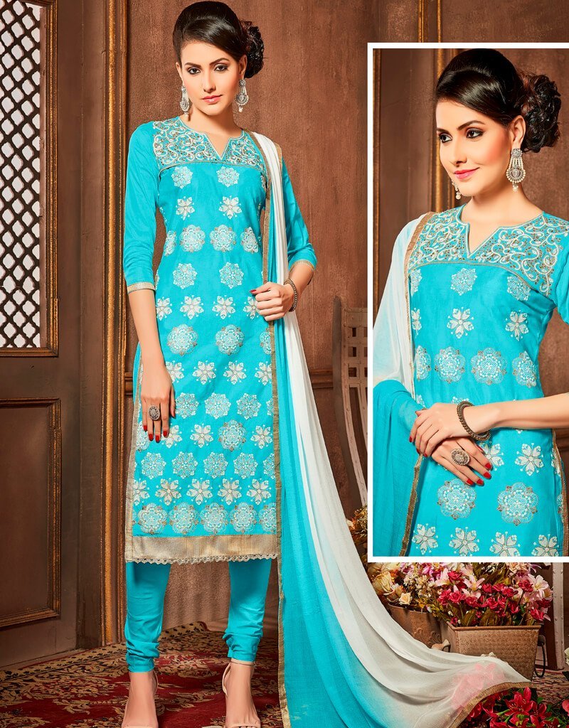 Office Wear Straight Sky Blue Colored Glazz Cotton Top With Sky Blue Colored Semi Loan Bottom.