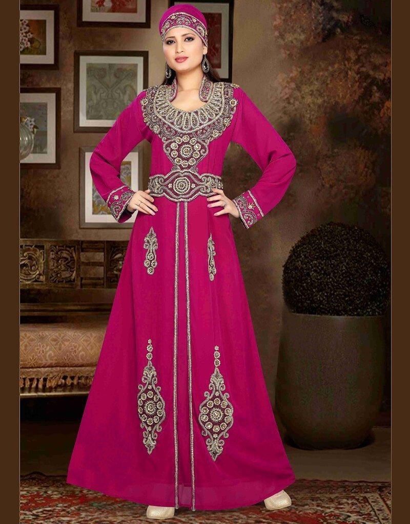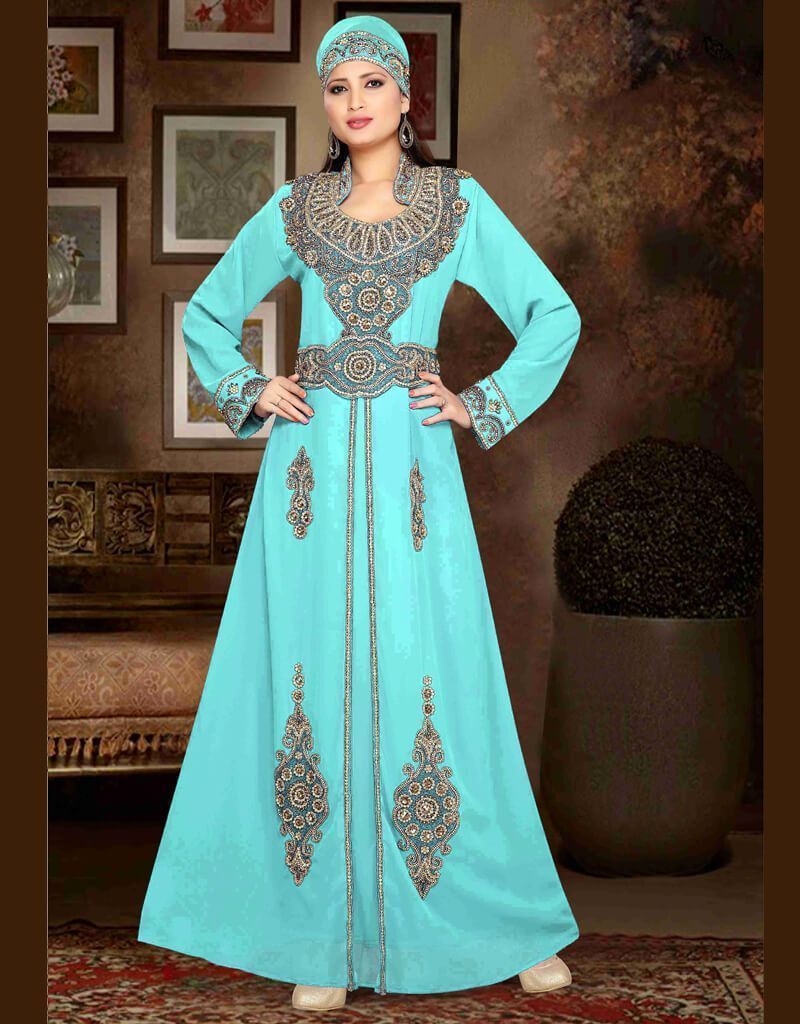 - Comes with detachable waist belt. PartyWear Moroccan style embroidered Kaftan with front Slit. Full sleeve gold beaded Kaftan