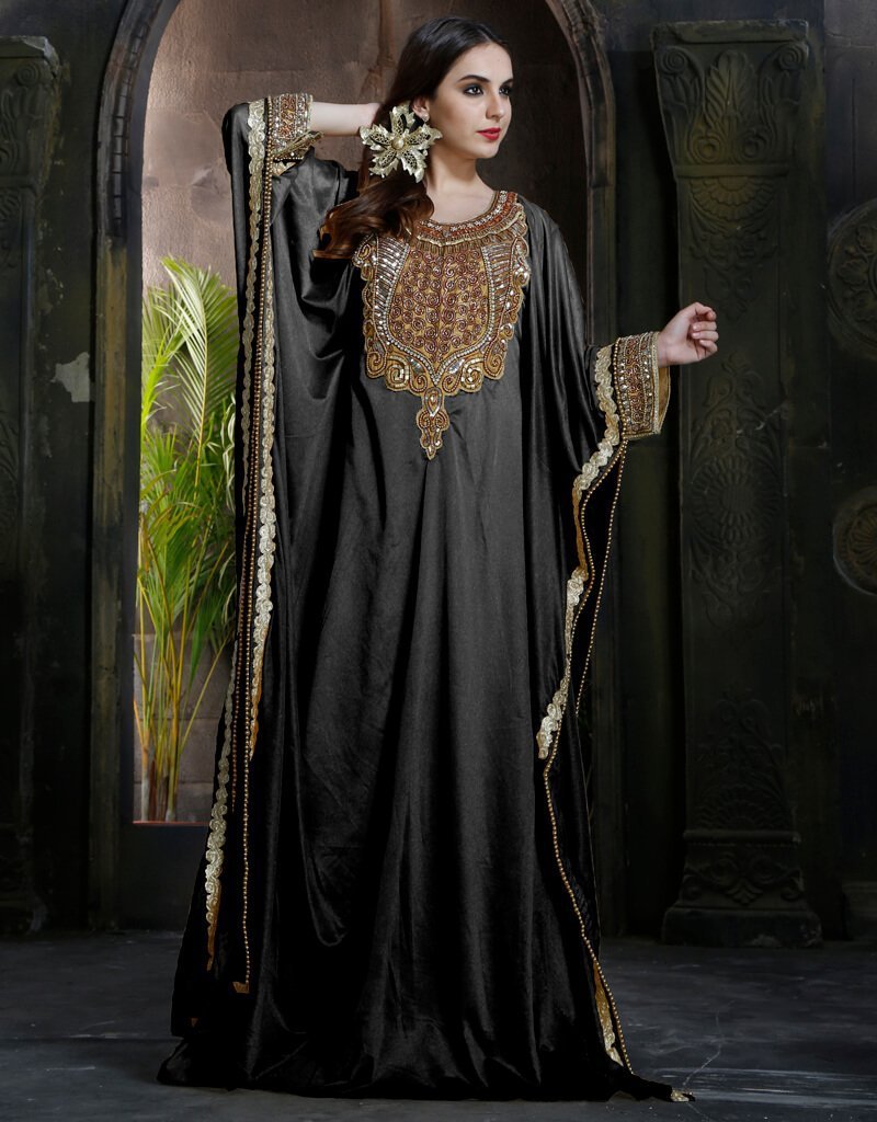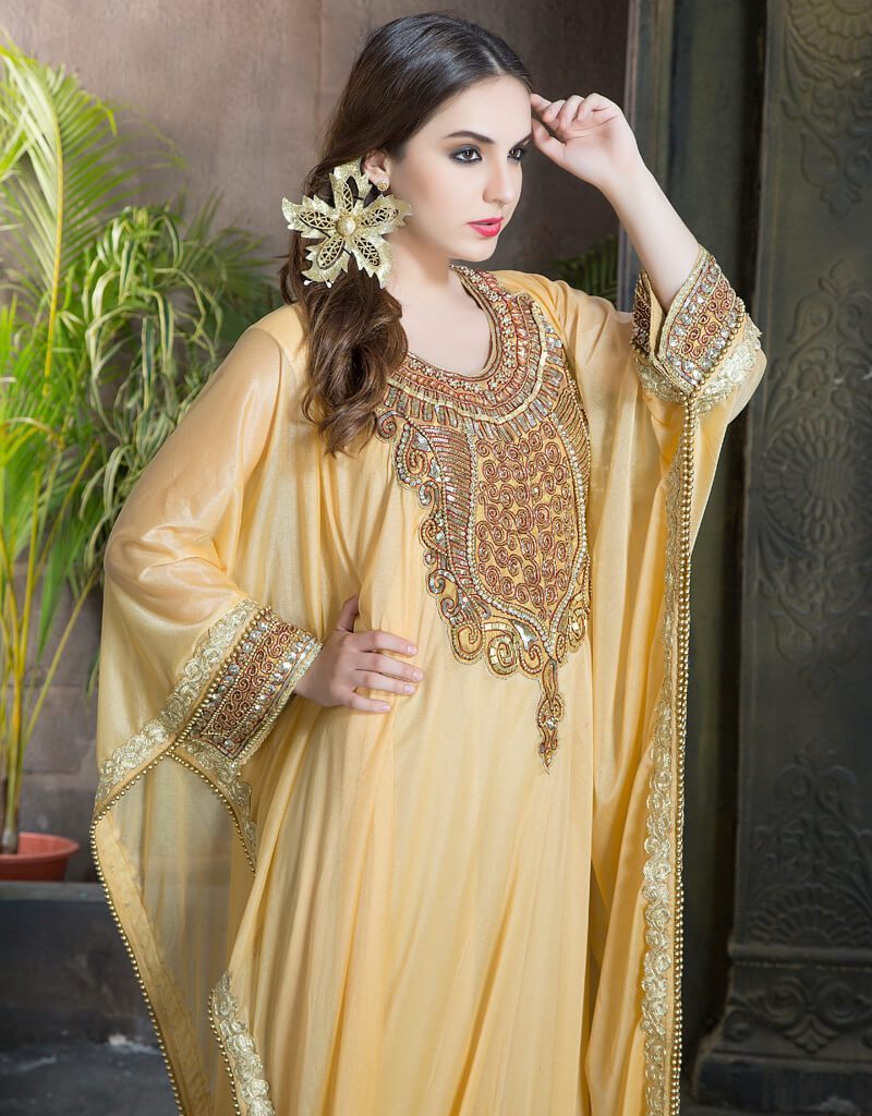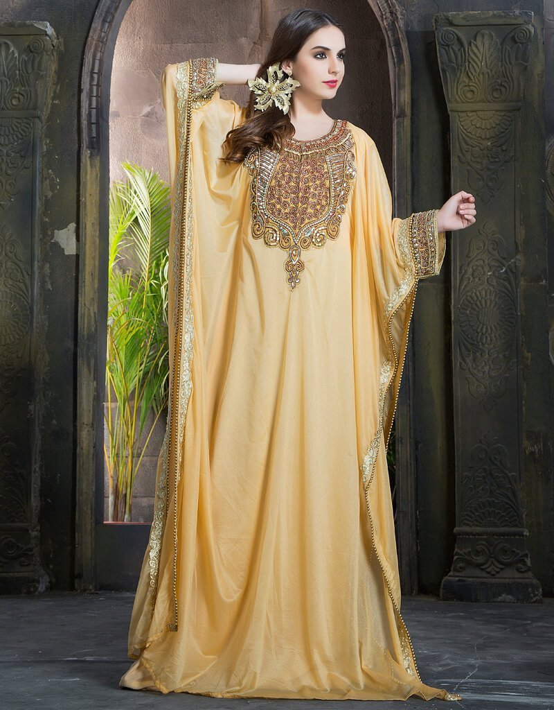 - Stylish Handmade Party kaftan Orange Color in Crepe Fabric with Golden Beautiful Hand Work