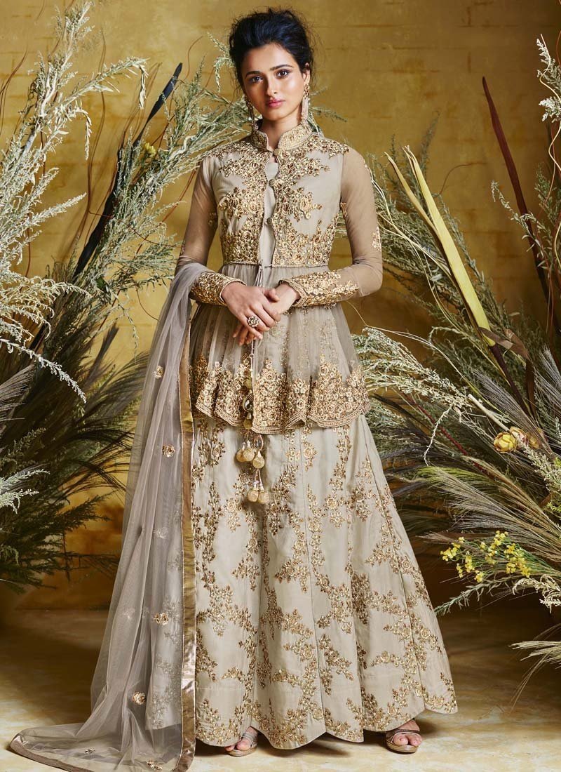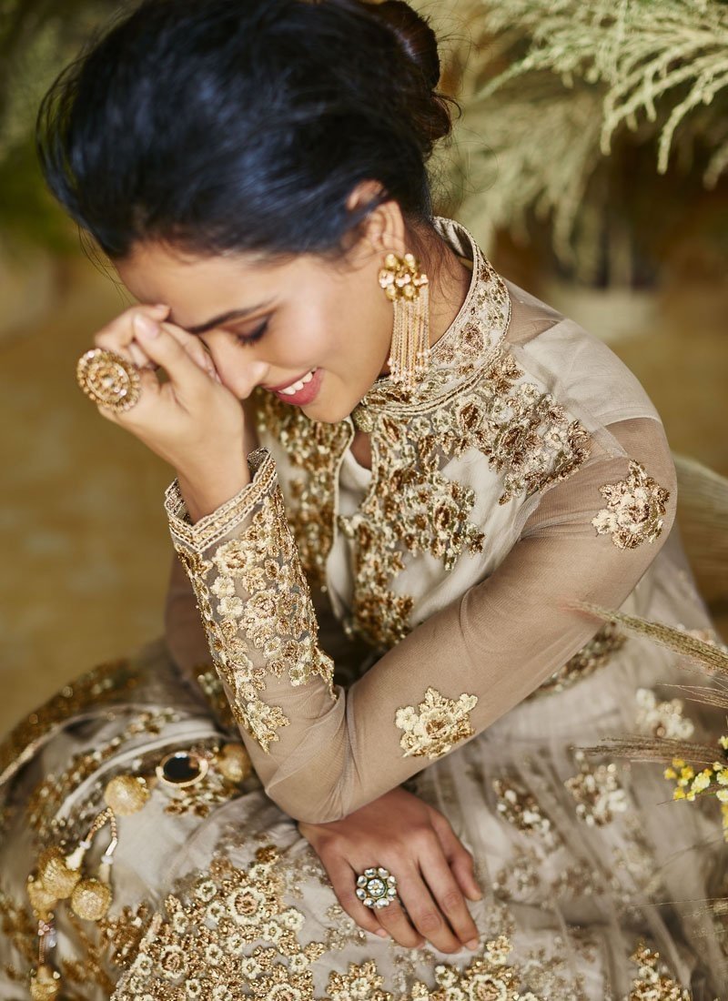 Tan Heavy Net With Pure Silk Lehenga Anarkali