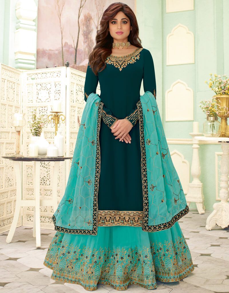 Partywear Teal Blue colored Salwar Kameez in Lehenga Style made with Real Georgette top and Real Georgette Bottom fabric