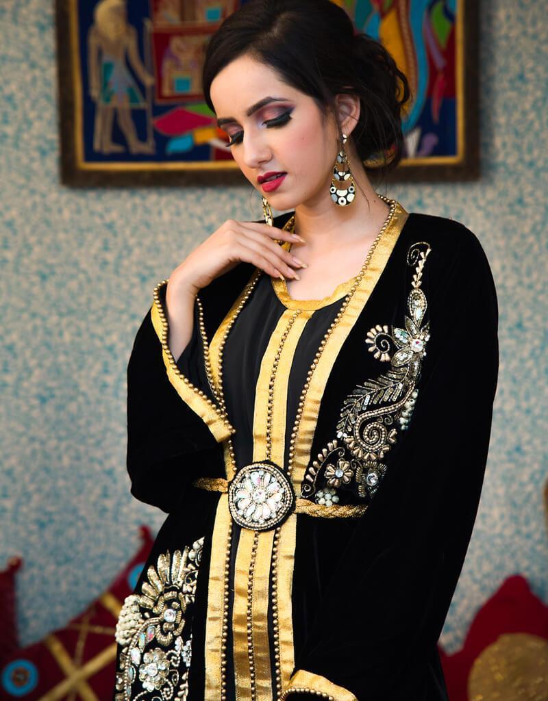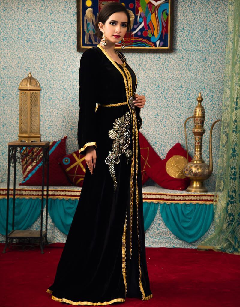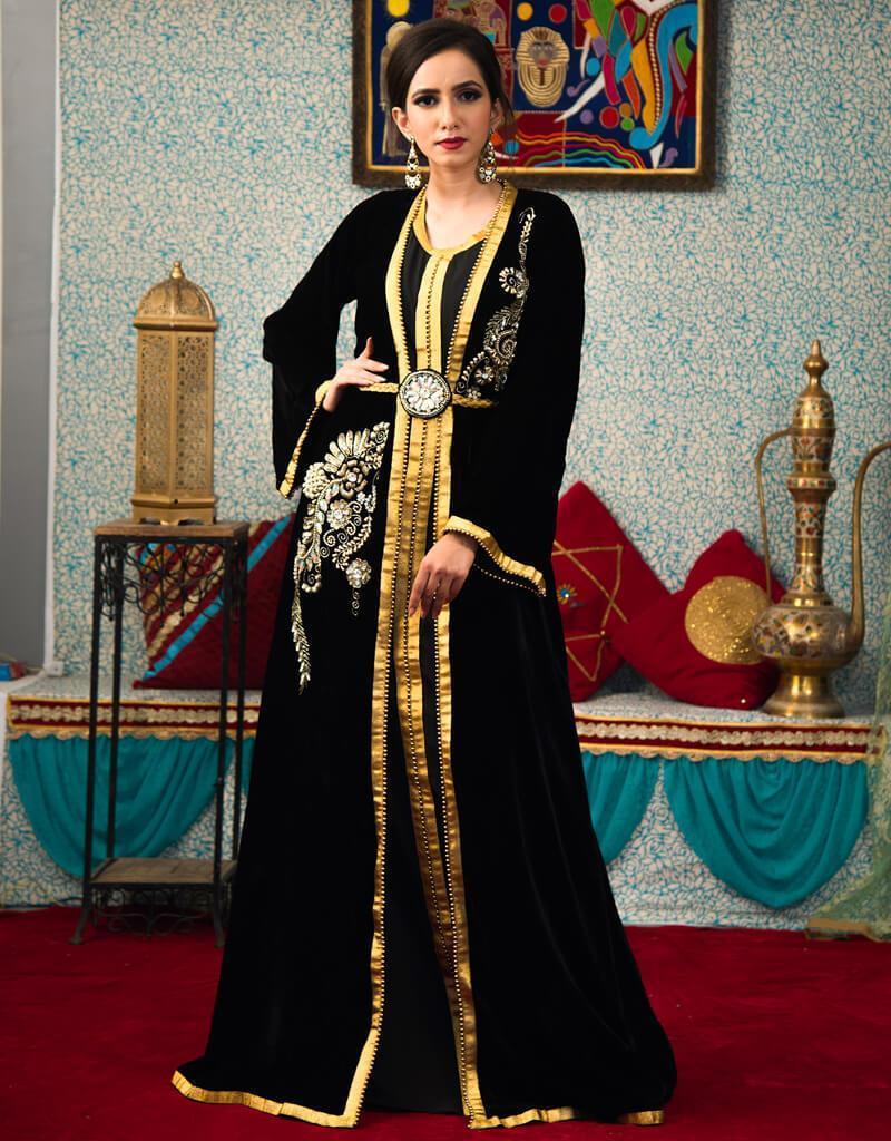 - Velvet Moroccan Style Kaftan Color in Velvet Fabric Printed Fabric with Golden Embroidered Color Establishment