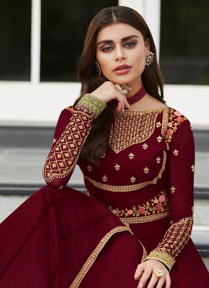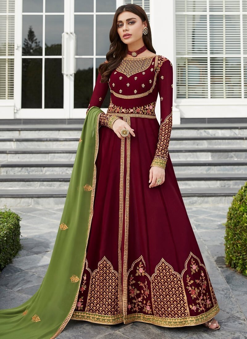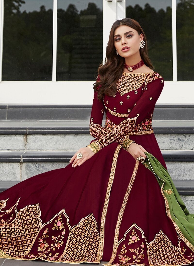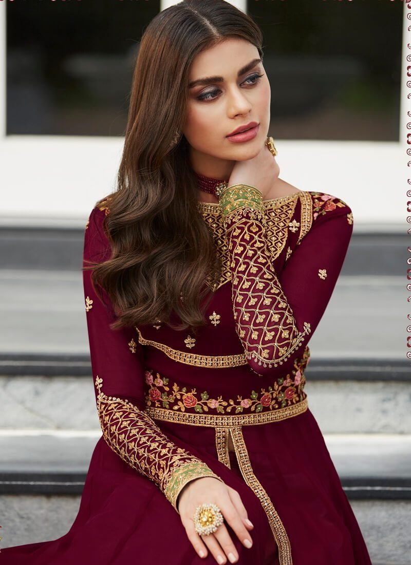 Arabic Muslim Wine colored Salwar Kameez in Anarkali Style made with Real Georgette top and Real Georgette Bottom fabric