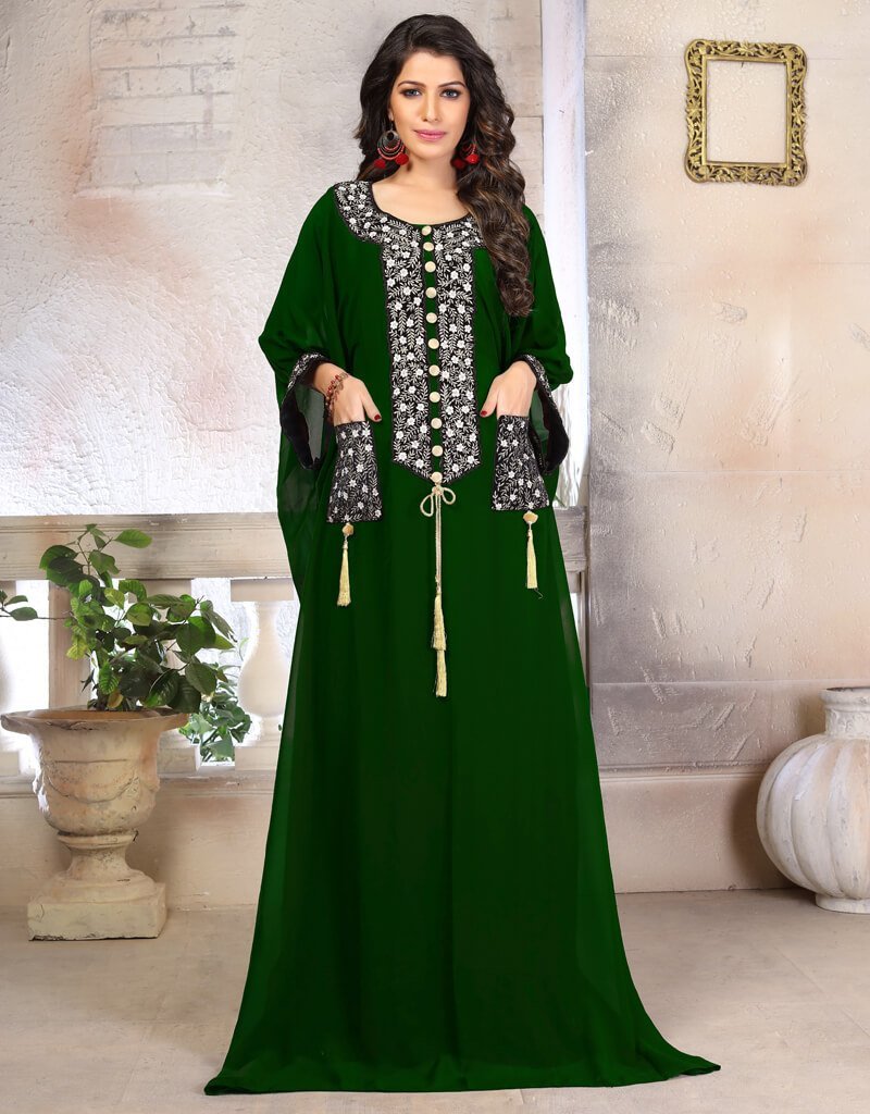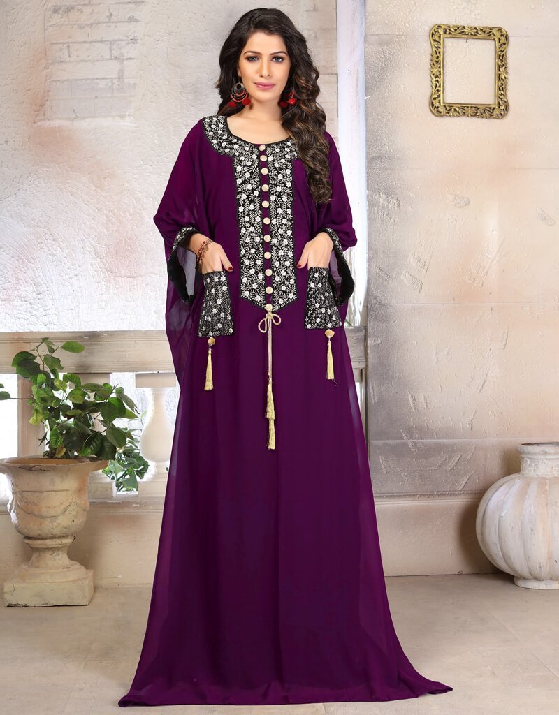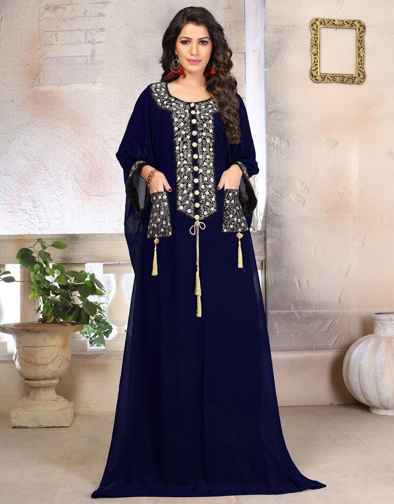 - Woman Georgette Kaftan Color in Georgette Printed Fabric with Golden Embroidered Color Establishment