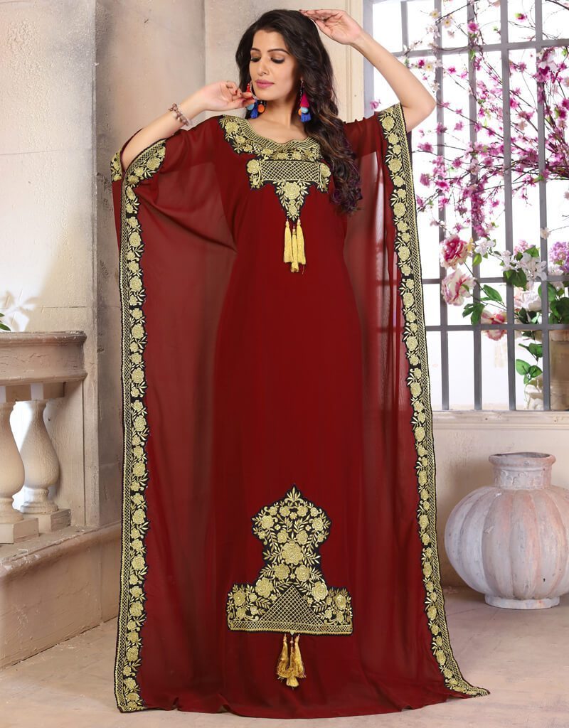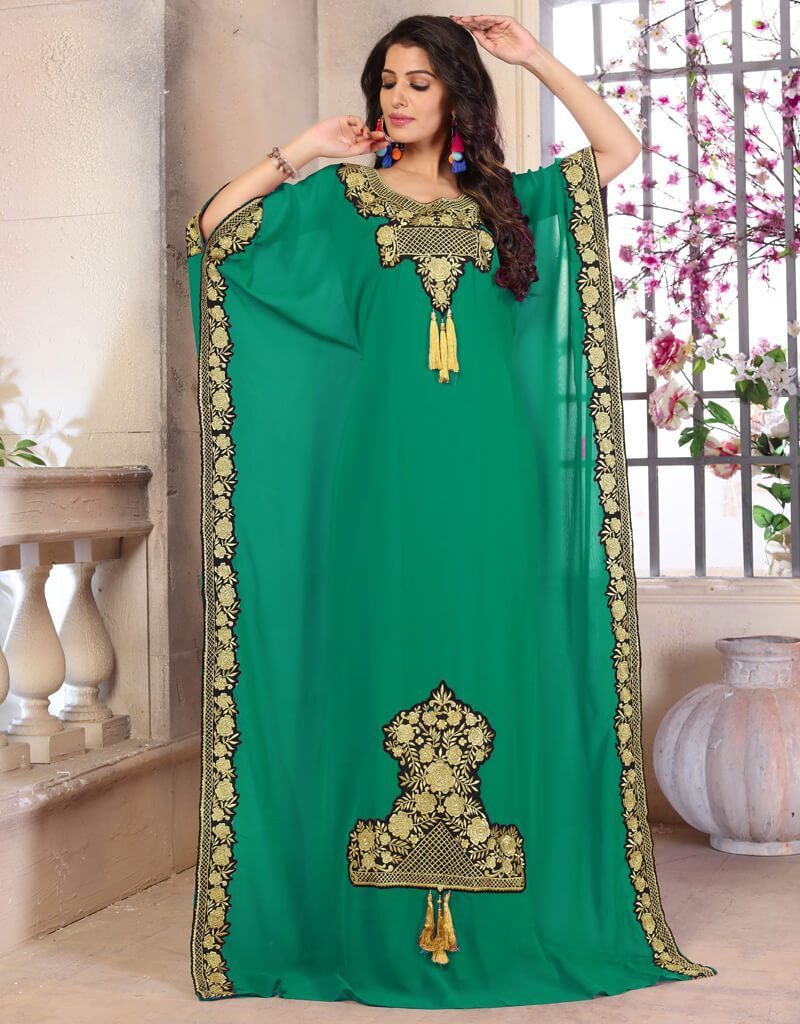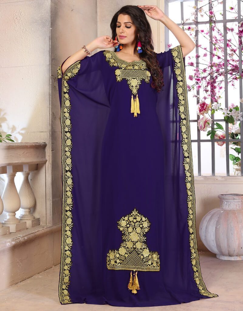 - Woman Georgette Modest Islamic Clothing Color in Georgette Printed Fabric with Golden Embroidered Color Establishment