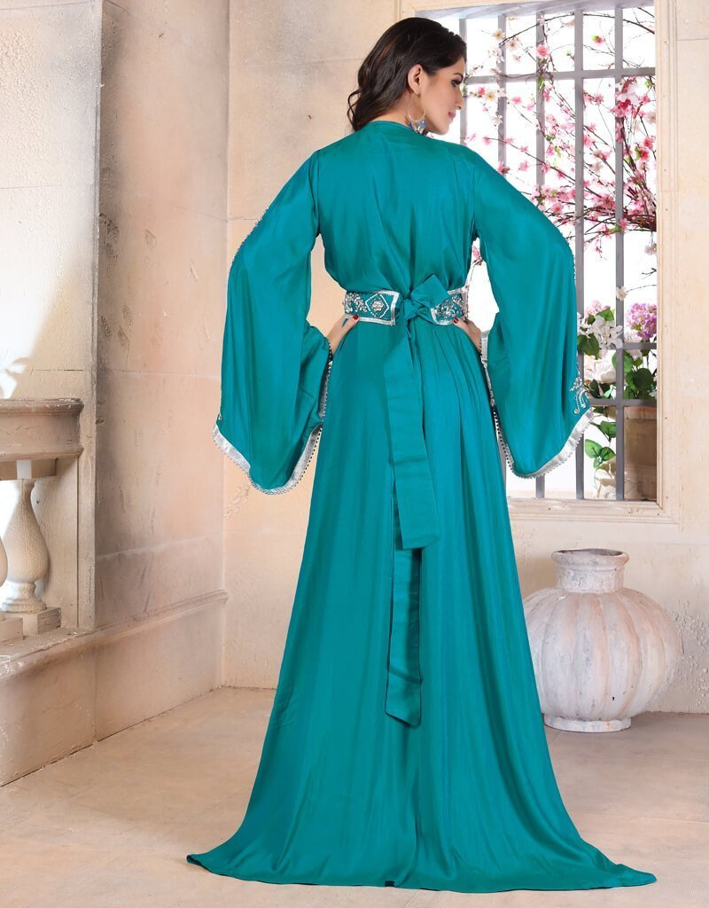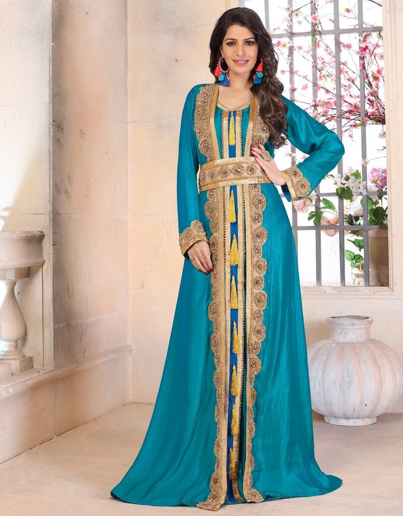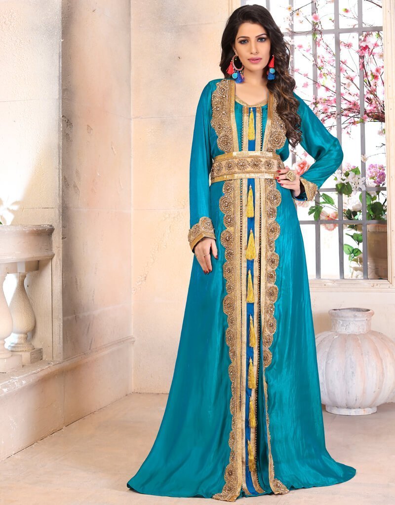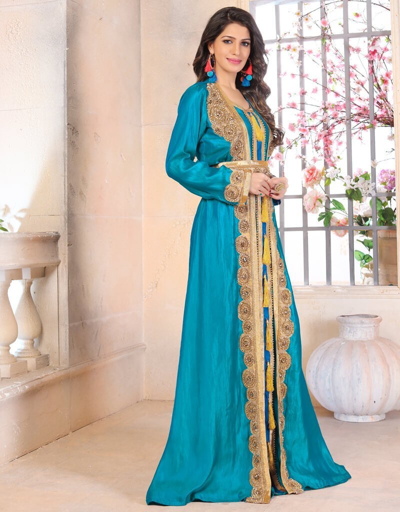 - Woman Moroccan Caftans Color in Silk Printed Fabric with Golden Embroidered Color Establishment