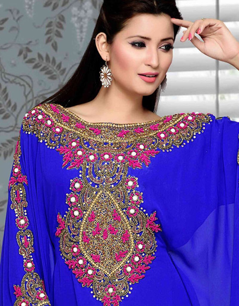 - Royal blue colored women partywear kaftan with pink thread work and gold establishments.