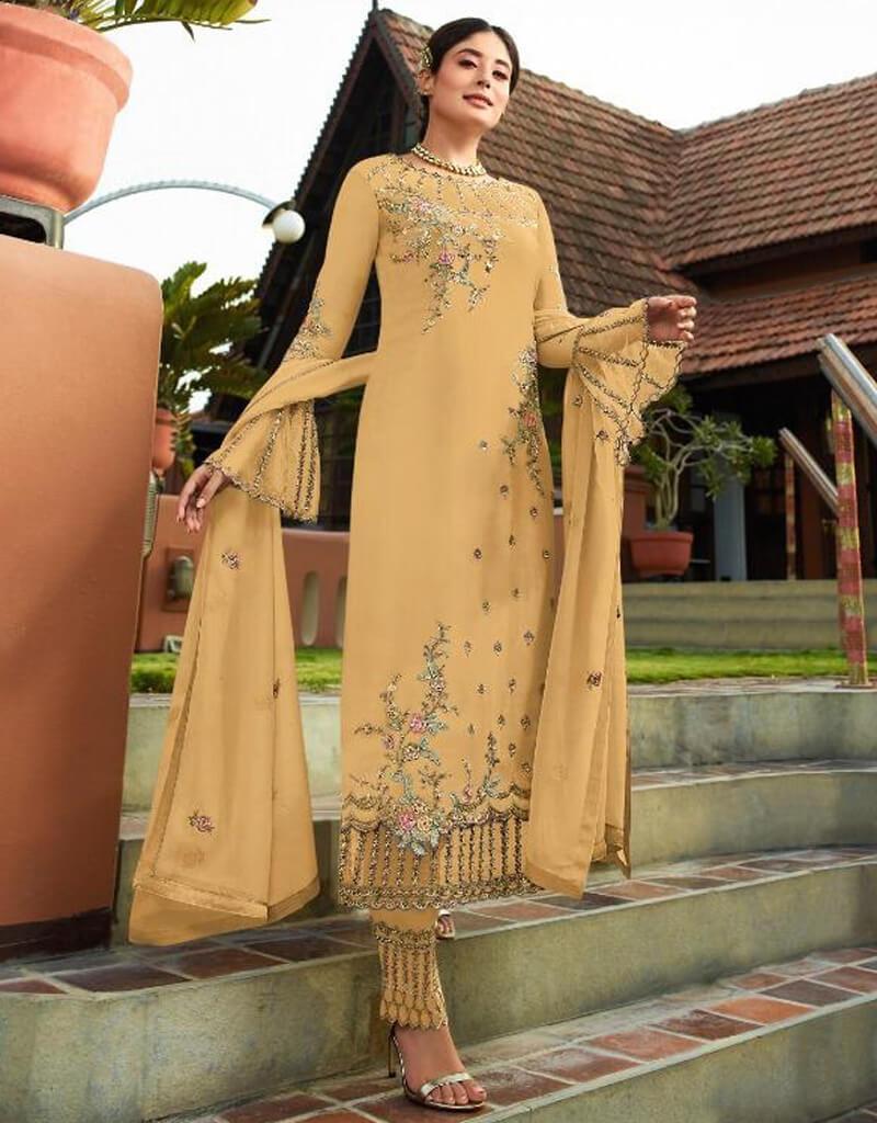 Designer Straight Yellow Colored Heavy Faux Georgette Top With Yellow Colored Heavy Santoon With Embroidery Work Bottom.